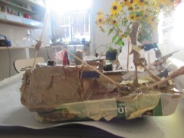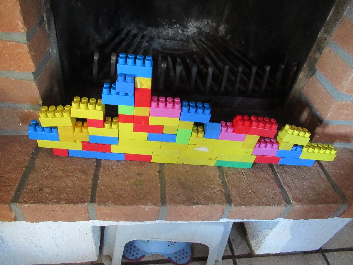 »Ja, najdem neki. Tole kar sam naredim. Neke škatle sem najdu in sem jih narezal na pol, krrežem, sem prov s temi [kleščami] rezal, samo nisem pa unga za šraufat rabu. To sem pa kar iz malih košev naredil. Imam pa eno še večjo. Tako gusarsko. Ta mi ni tok dobro stala in sem dal kip, sem dal lepilo gor. /…/ Sem pa naredu še neki, zlagam neko tako ladjo iz lego kock, tak se mučim, Bismarcka zlagam. Po svoje delam [ne po navodilih]. Po svoje je boljše. Tok jo hočem končat, že tri dana jo delam. Še neki danov rabim, neke tope še in letalo [moram naredit]«.